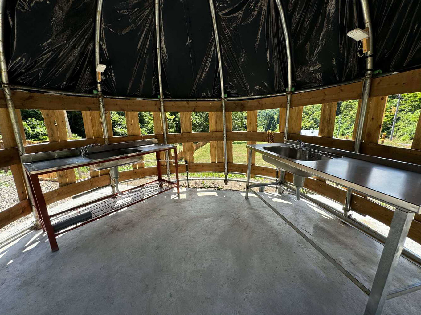 ドーム型の炊事場(左)と男女別の共同トイレ(右) キャンプサイト全体で1ヶ所となります。
