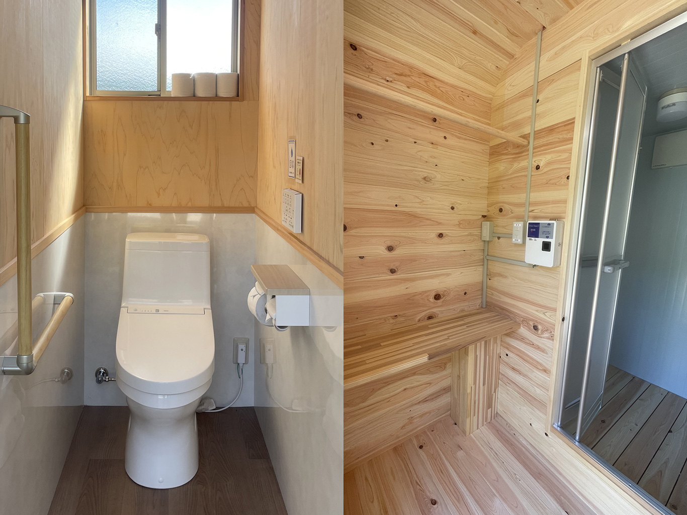 ウォッシュレット(水洗)、シャワーはコイン式(5分300円)にて 共にヒノキ壁で清潔な空間を心掛けています。